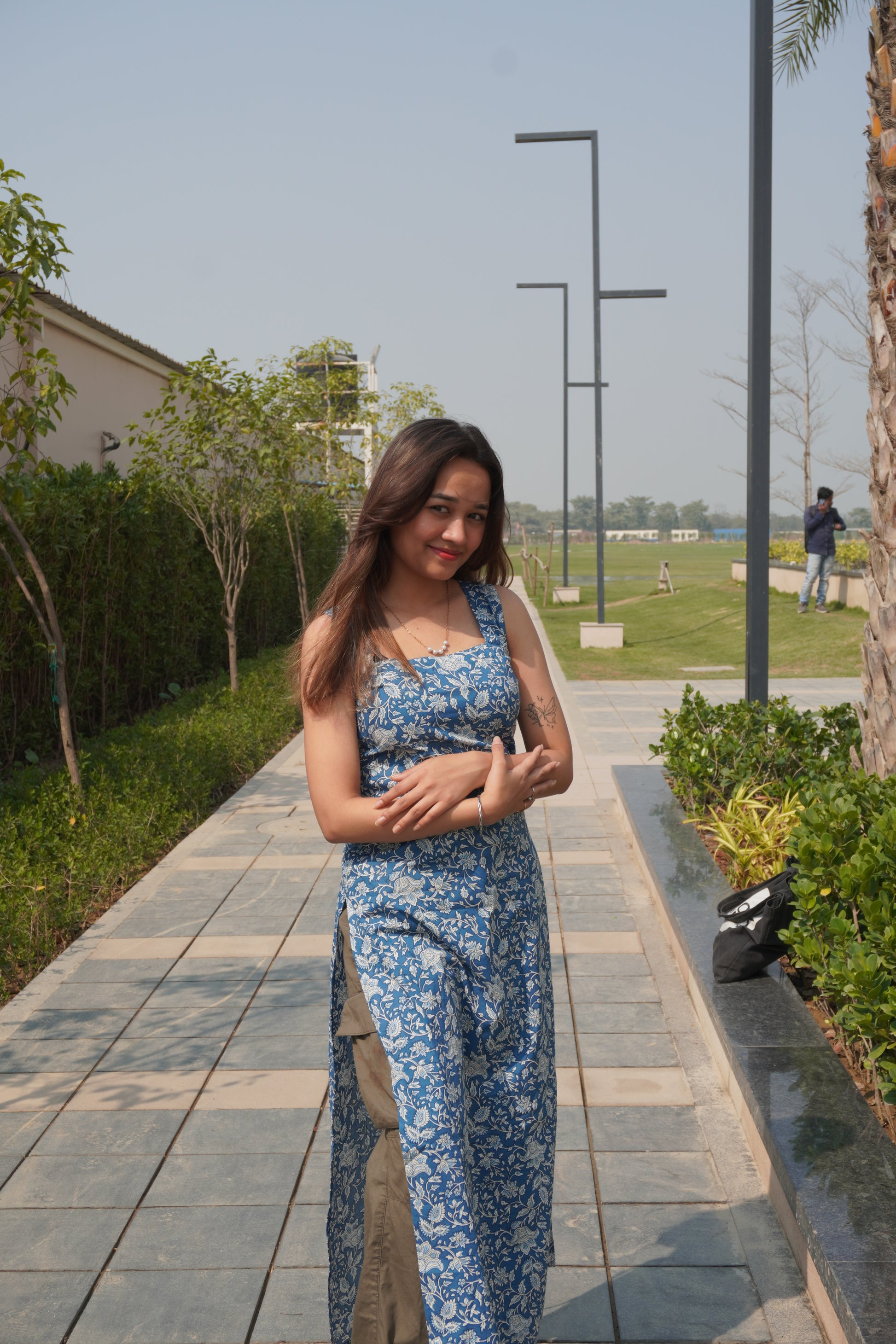 The soothing blue base with delicate white floral print makes it perfect for summer outings, college wear, office days, brunch dates, and everyday styling. Designed in a calf-length silhouette with side slits, it offers both ease of movement and a flattering shape.