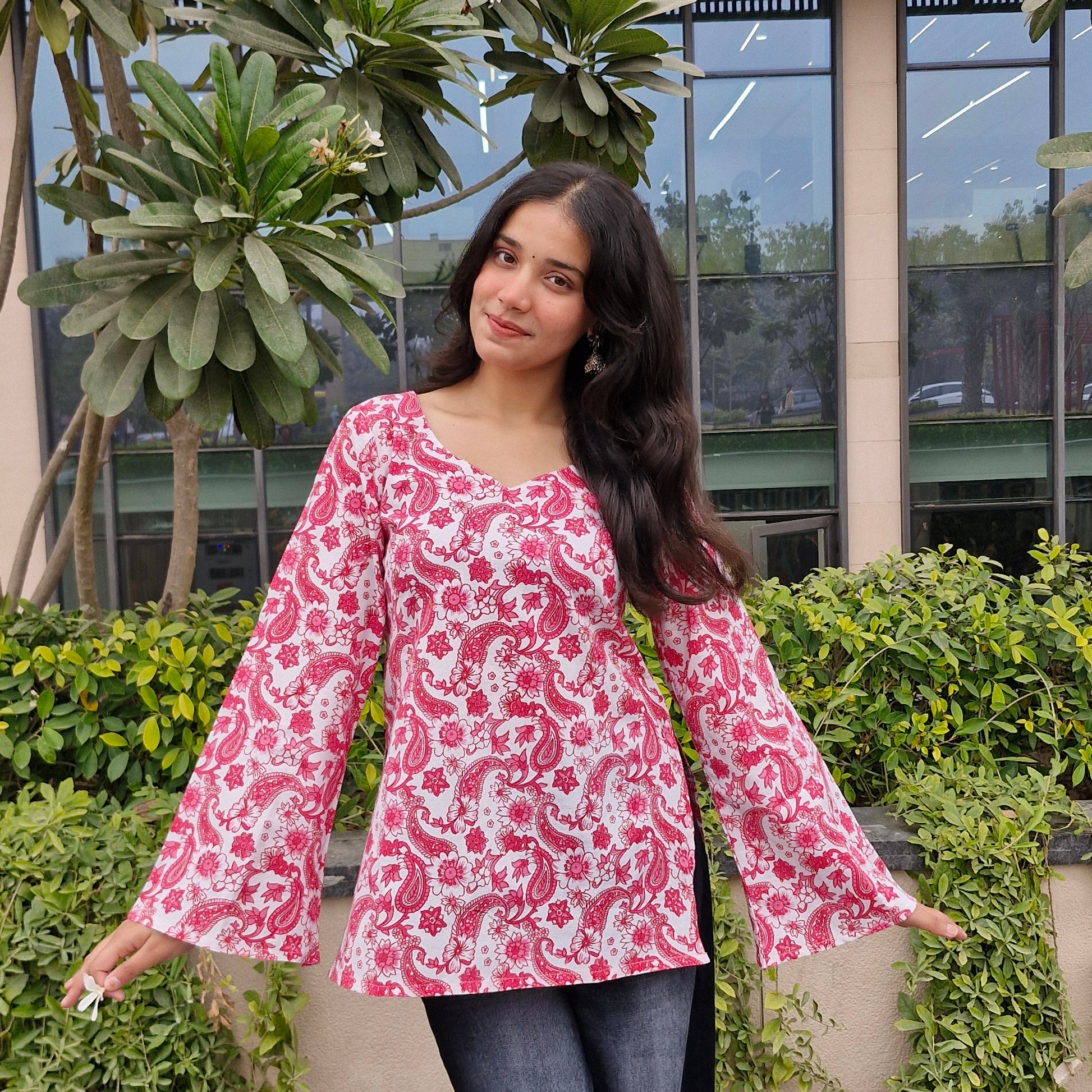Cotton Printed Short Kurti with Betel Leaf Neck & Bell Sleeves for Women