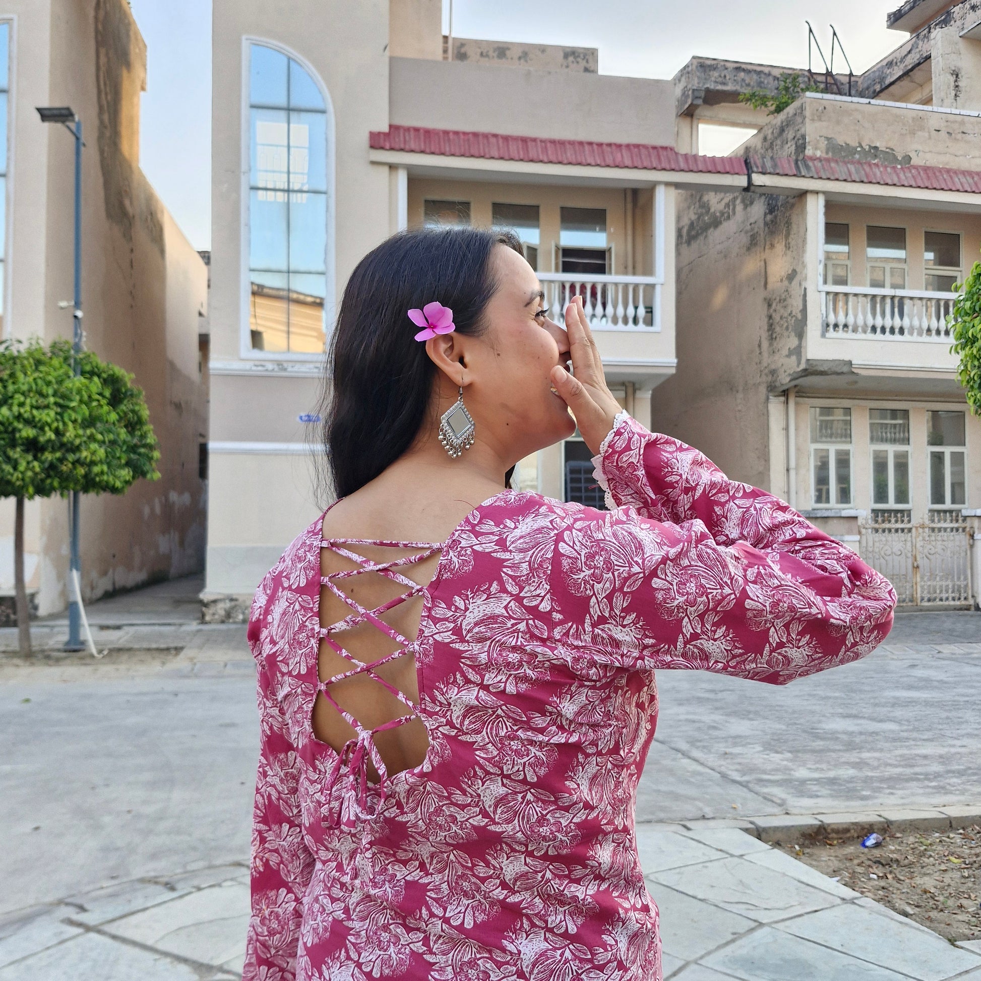 Designed with a sweetheart neckline and bell sleeves with lace detailing, this kurti adds a graceful feminine touch. The highlight is its backless design with tie-up detailing, giving it a stylish twist that makes you stand out on any occasion.